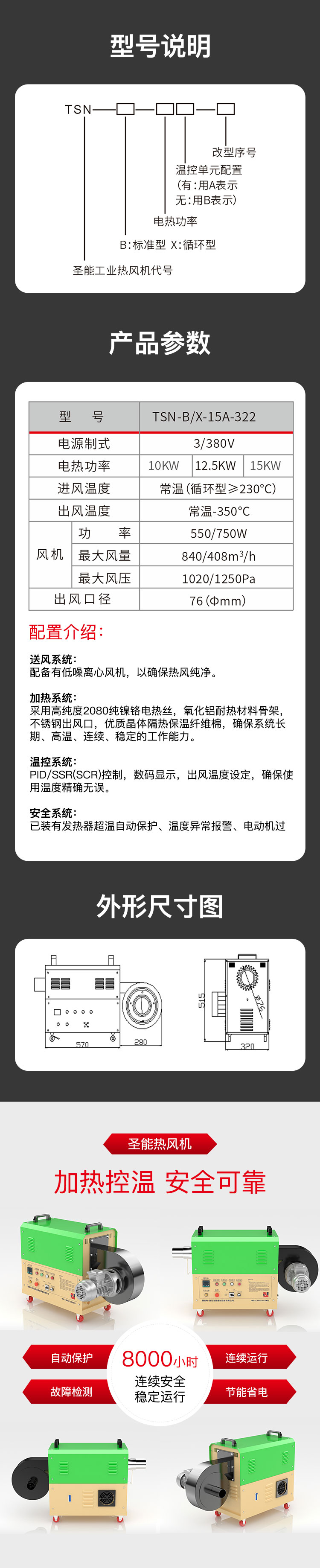 “TSN”工業熱風機主要由送風系統、加熱系統、溫控系統三大部分部分組成。通電后,鼓風機把空氣吹送到加熱器里,令空氣從螺旋狀的電熱絲內、外側均勻通過,電熱絲通電后產生的熱量與通過的冷空氣進行熱交換,從而使出風口的風溫升高。出風口處的K型熱電偶及時將探測到的出風溫度反饋到溫控儀,儀表根據設定的溫度檢測著工作的實際溫度,并將有關信息傳遞回固態繼電器進而控制加熱器是否工作。同時,鼓風機可利用風量調節器(變頻器、手動)調節吹送空氣的風量大小。另外,送風系統及加熱器,均有過載超溫自動保護裝置,總電路也設計了緊急摯,以保證安全,防止錯誤操作。