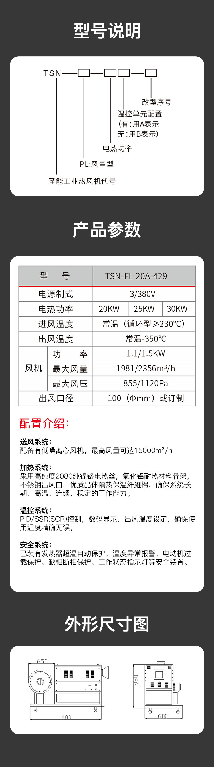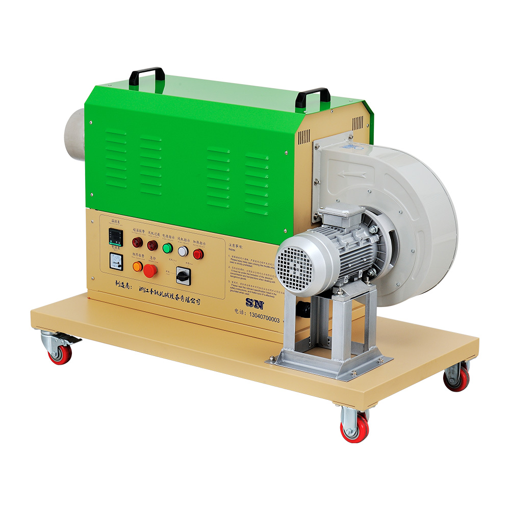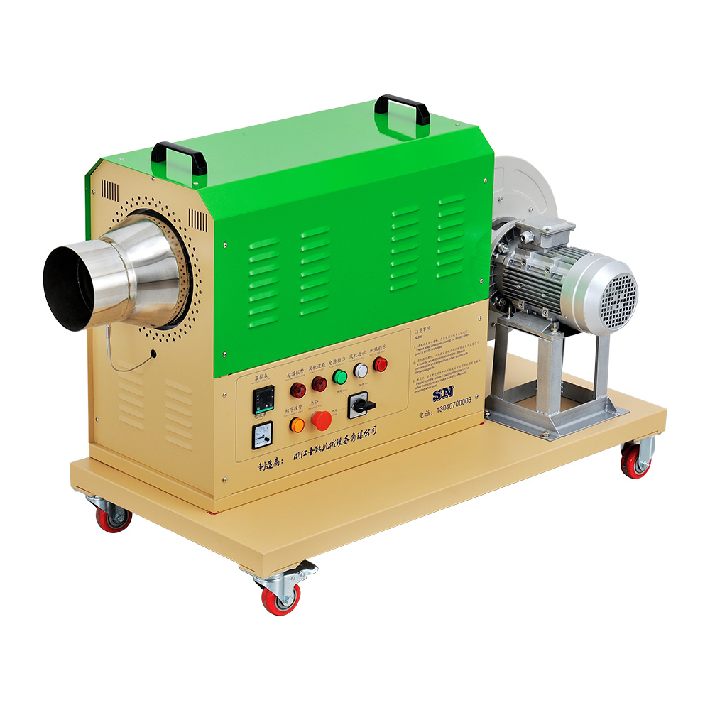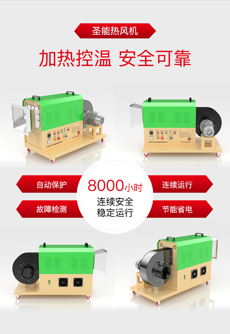 風(fēng)量型熱風(fēng)機主要由空氣加熱器和離心風(fēng)機組成。空氣加熱器加熱產(chǎn)熱散熱,由離心風(fēng)機將熱量輸出,從而調(diào)節(jié)空間溫度,風(fēng)量型熱風(fēng)機中加熱元件由2080鎳鉻絲加工成螺旋導(dǎo)管組成,從而發(fā)熱快、溫度效果好、工作風(fēng)量大壓力較低。根據(jù)使用場所可分為:家用風(fēng)量型熱風(fēng)機和農(nóng)業(yè)用風(fēng)量型熱風(fēng)機。從而家用和農(nóng)業(yè)用風(fēng)量型熱風(fēng)機需根據(jù)客戶使用情況來進(jìn)行風(fēng)機和加熱功率的配比,望請客戶采購時將現(xiàn)場工況詳細(xì)說明。