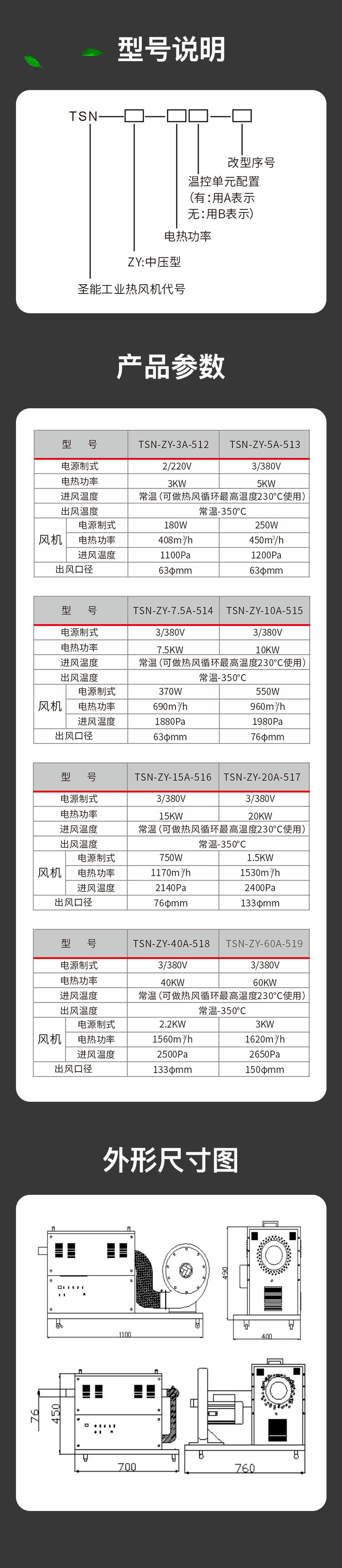 “TSN”工業熱風機主要由送風系統、加熱系統、溫控系統三大部分部分組成。通電后,鼓風機把空氣吹送到加熱器里,令空氣從螺旋狀的電熱絲內、外側均勻通過,電熱絲通電后產生的熱量與通過的冷空氣進行熱交換,從而使出風口的風溫升高。出風口處的K型熱電偶及時將探測到的出風溫度反饋到溫控儀,儀表根據設定的溫度檢測著工作的實際溫度,并將有關信息傳遞回固態繼電器進而控制加熱器是否工作。同時,鼓風機可利用風量調節器(變頻器、手動)調節吹送空氣的風量大小。另外,送風系統及加熱器,均有過載超溫自動保護裝置,總電路也設計了緊急摯,以保證安全,防止錯誤操作。